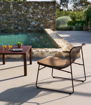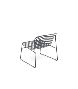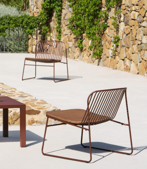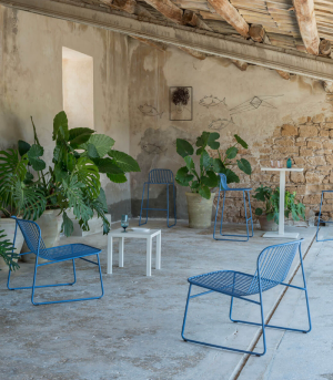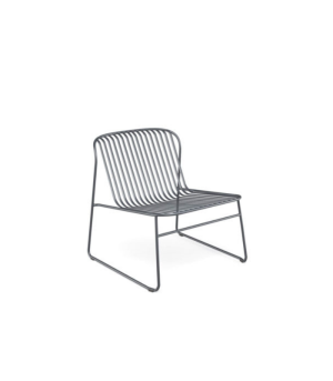 Diseñada por Lucidi/Pevere, Riviera es una colección compuesta por una silla, un sillón pequeño, una tumbona y un taburete; su principal característica es un elegante diseño gráfico minimalista. La estructura, totalmente soldada, está hecha de tubo de acero Fe360 y barras redondeadas (media almendra). Acabado EMU-Coat (cataforesis + pintura).
