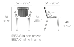 La silla IBIZA con reposabrazos, diseñada por Eugeni Quitllet para VONDOM, está fabricada en polipropileno inyectado reforzado con fibra de vidrio, ofreciendo robustez y ligereza. Apilable y disponible en varios colores, es ideal para uso interior y exterior. Además, el acabado «Vondom Revolution» significa que está hecha de plástico 100% reciclado del mar Mediterráneo.
