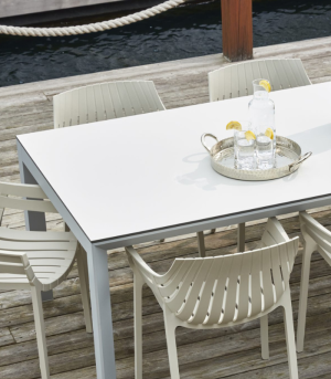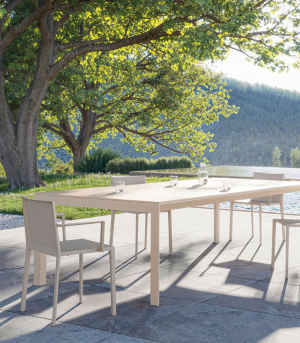 La table de salle à manger Frame, conçue par Ramón Esteve, est née de la recherche de formes sereines et intemporelles qui s’intègrent dans n’importe quel environnement architectural. Sa structure en aluminium extrudé et sa base en aluminium moulé laqué offrent une durabilité extrême et une légèreté visuelle inégalée. Associée à un plateau en HPL haute résistance, cette table est la pièce maîtresse idéale pour les repas de luxe en plein air, garantissant un entretien minimal et une élégance persistante sous le soleil méditerranéen.