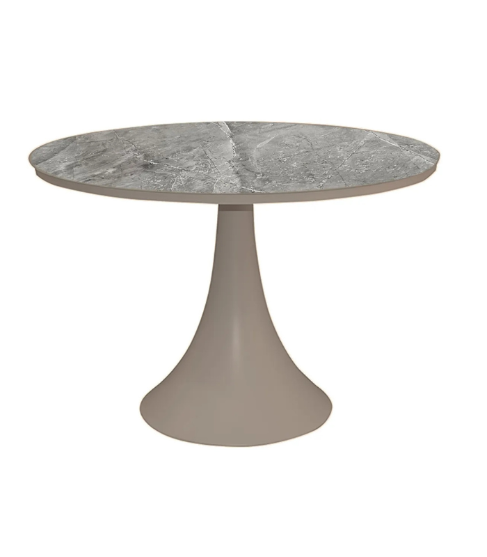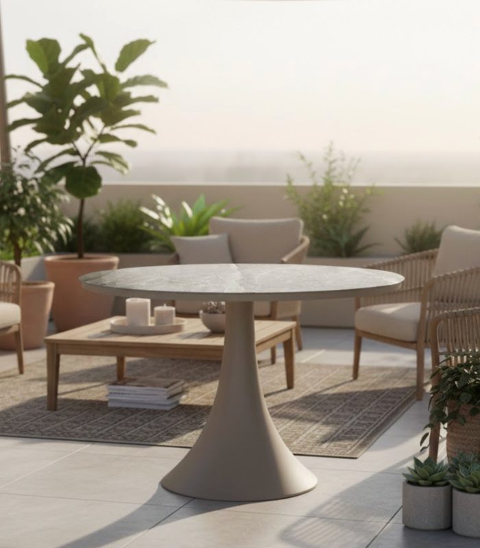 La table DANO allie l’ingénierie moderne à la beauté éternelle de la pierre technique. Son plateau Dekton Ava offre une esthétique marbrée chaleureuse et des performances inégalées : il est résistant aux rayures, au feu, aux taches et aux rayons UV, garantissant une durabilité éternelle sans aucun entretien. Avec un diamètre de 108 cm, c’est la taille parfaite pour des dîners intimes pour 4 personnes sur des balcons ou des terrasses où il est essentiel de maximiser l’espace sans faire de compromis sur l’excellence. La structure en aluminium beige adoucit l’aspect, s’intégrant parfaitement au style méditerranéen lumineux de la Costa Brava.