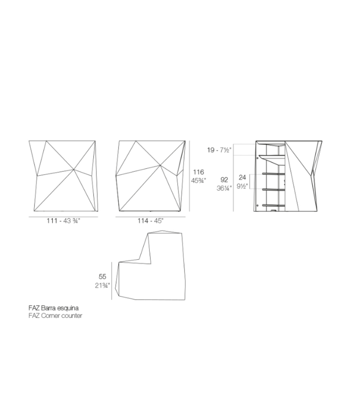 Complétez votre projet de divertissement en plein air avec le module d’angle FAZ, une pièce architecturale créée par Ramón Esteve pour Vondom. Cet élément permet d’articuler des espaces de bar sophistiqués, en s’adaptant à la géométrie de votre terrasse ou de votre jardin avec une élégance sans précédent. Sa structure à facettes n’est pas seulement fonctionnelle, mais agit comme une sculpture moderne qui définit les environnements de luxe dans les villas et les centres de villégiature exclusifs.