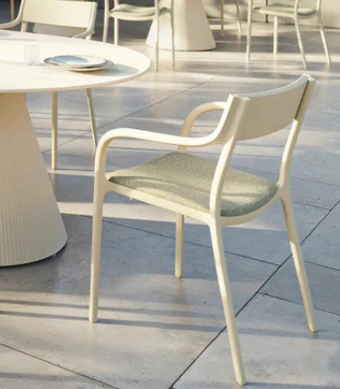 La chaise MADISON Upholstered, une création du célèbre Eugeni Quitllet pour Vondom, intègre un rembourrage de qualité supérieure qui améliore le confort tout en conservant la légèreté emblématique de sa structure en résine. Conçue pour offrir une expérience ergonomique supérieure, elle utilise des tissus techniques préparés pour résister aux conditions climatiques méditerranéennes les plus exigeantes.