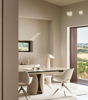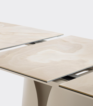 The ARTE extensible table is a statement of contemporary luxury and technical refinement. Its spectacular light beige Onyx-effect ceramic top, reinforced with a tempered glass underlayer, offers unique visual depth and exceptional strength. Supported by an epoxy powder-coated steel frame, this table is the ideal solution for villas seeking a sculptural piece capable of adapting to large social gatherings with its extension system reaching up to 240 cm.