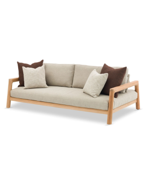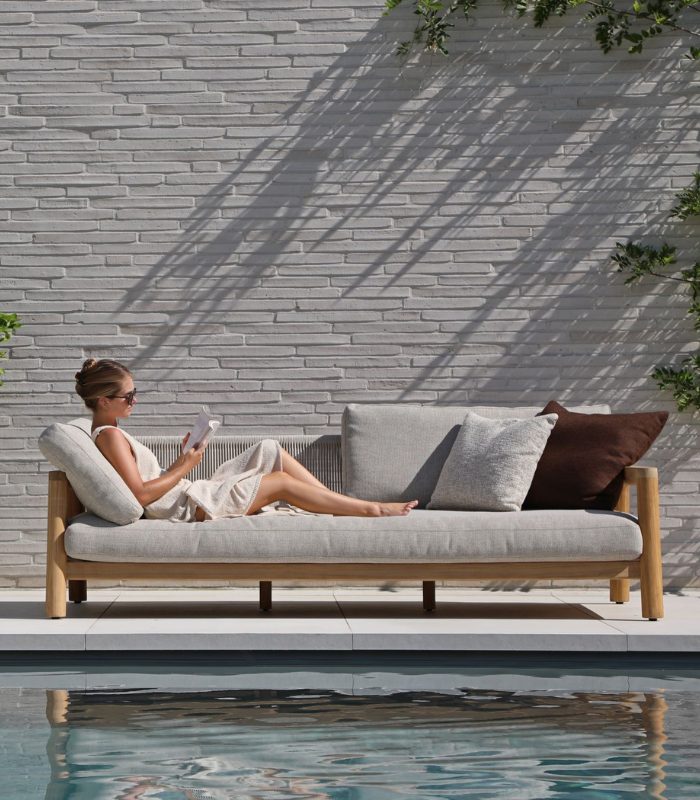 With an imposing length of 236 cm, the Aruna 3-seater sofa stands as the undisputed protagonist of large outdoor spaces. Its design combines the nobility of solid teak with generous ergonomics of 126 cm depth, allowing its use both as formal seating and as a daybed-style relaxation zone for multiple people. The voluminous beige Olefin cushions offer a “cloud-like” seating experience resistant to severe weather. This piece is an investment in style and durability, ideal for expansive gardens on the Costa Brava or exclusive pool areas in Ibiza.