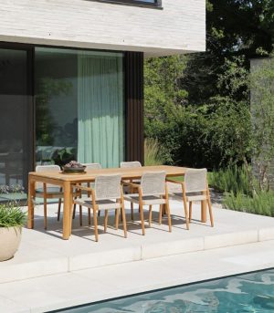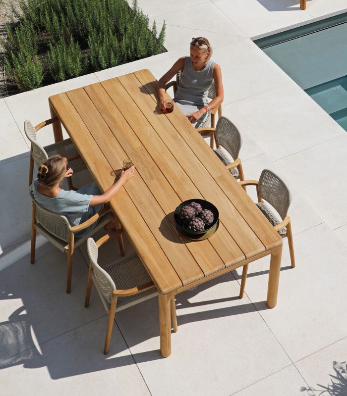 Celebrate the Mediterranean lifestyle around the 240 cm Aruna dining table. Designed to comfortably accommodate 8 to 10 guests, this table is a statement of intent: solidity, nature, and timeless elegance. Made entirely of solid teak, its wide surface and sturdy legs withstand intensive use and harsh weather, aging with dignity. It is the ultimate centerpiece for large terraces or summer dining rooms in villas, pairing perfectly with Aruna stackable armchairs for a cohesive and sophisticated look.