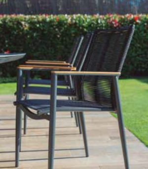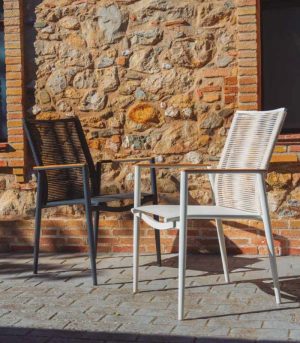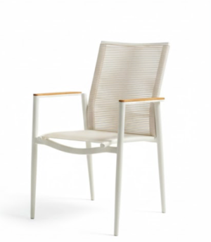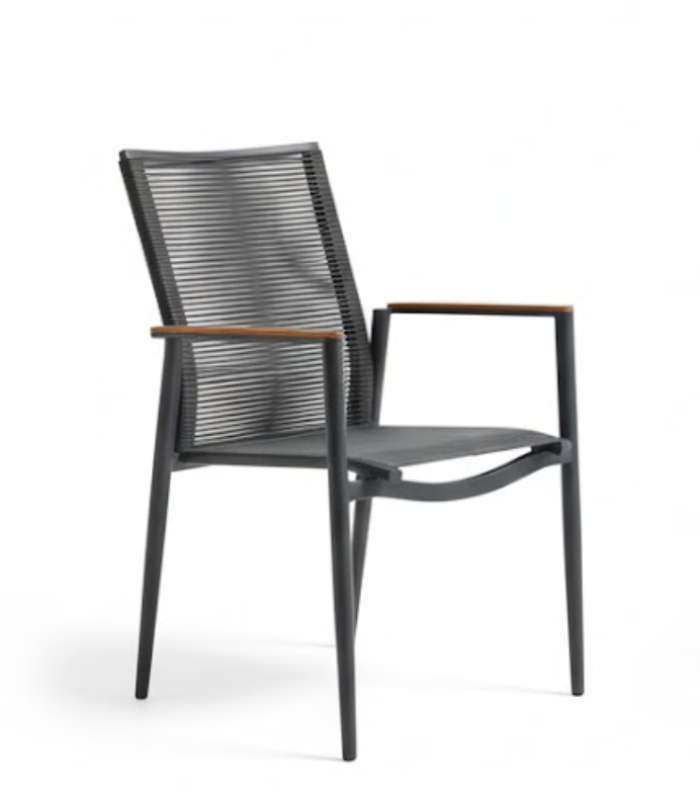 The Dalia armchair is a masterclass in combined textures. Its powder-coated aluminum structure ensures lightness and strength, but it is the detail of the natural teak wood armrests that defines its character, adding warmth to the touch and an elegant contrast. The backrest, hand-woven with synthetic rope, offers a sophisticated and enveloping aesthetic, while the Sling fabric seat ensures an ergonomic and cool seating experience. Furthermore, its stackability makes it a practical and luxurious solution for dynamic dining areas on the Costa Brava.