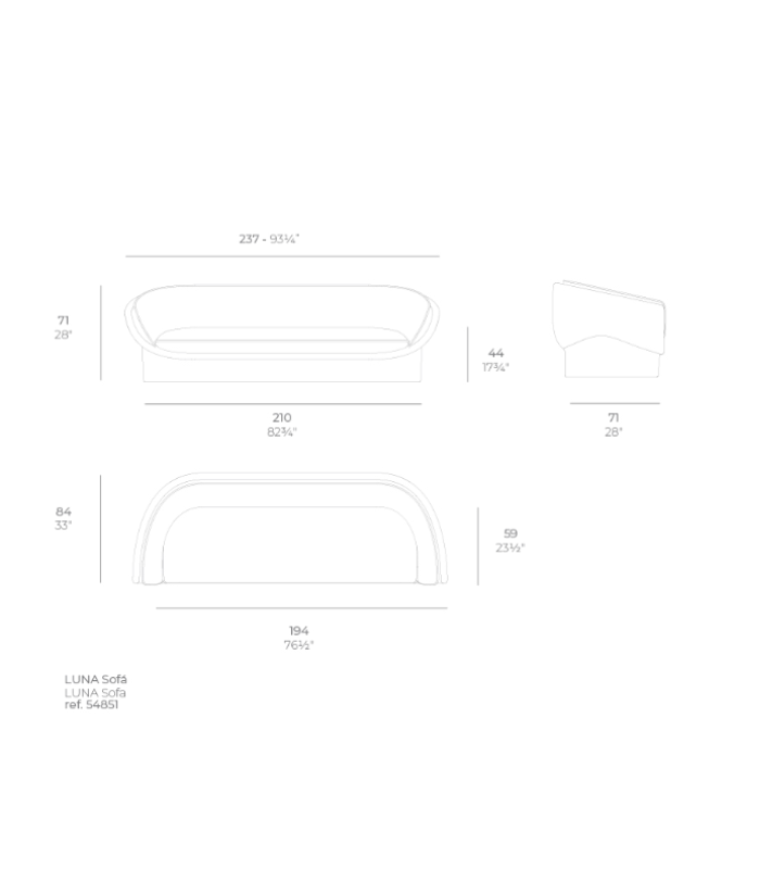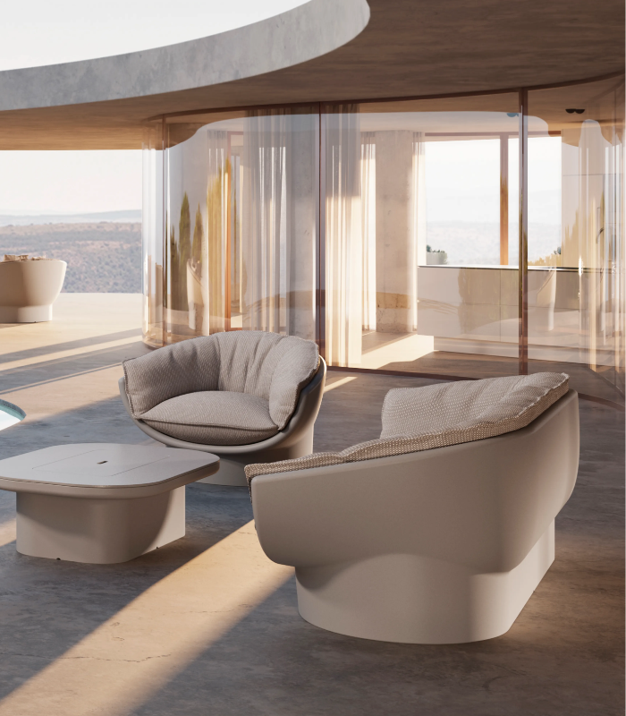 The LUNA sofa, designed by the renowned architect Ramón Esteve, redefines contemporary outdoor luxury. Its 100% recyclable polyethylene structure, manufactured using advanced rotational moulding techniques, guarantees unalterable resistance against salinity and intense sunlight. Equipped with high-density polyurethane foam and synthetic fiber cushions, this sofa offers unrivalled comfort, becoming the centerpiece of any high-end terrace or garden.