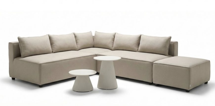 Versatile and elegant, the ottoman from the Miami collection complements your modular set by adding extra functionality. Its 81×81 cm structure allows it to be used as a comfortable footrest, an independent auxiliary seat, or, by adding a tray, as a textile coffee table. Upholstered in the exclusive Champagne Beige Chiné fabric on a Charcoal base, it maintains the sophisticated aesthetic coherence of the entire line.
