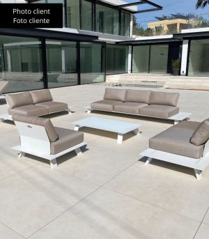 The Neverland 1-seater armchair is much more than a seat; it is a personal refuge of comfort. Designed with generous width, it allows for deep, relaxed seating, perfect for reading or individual unwinding. Its “white block” aesthetic in aluminum, combined with the textile richness of the Agora cushions (in Khaki or Artic), makes it a statuesque piece on its own. It is essential for visually closing “U” shaped sofa sets or creating independent reading corners next to a side table.