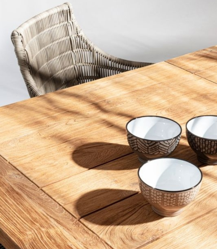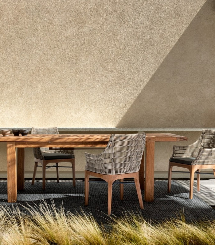 The PROCIDA table redefines sustainable luxury in outdoor furniture. Crafted from SVLK-certified reclaimed teak, this piece features an impressive 4 cm thick top and a rustic aesthetic that celebrates the nobility of the wood. Equipped with a central butterfly extension and aluminum glides, it offers unparalleled versatility for hosting guests in exclusive villas and residences. Each table is unique, showcasing natural marks and imperfections that tell the story of a timeless, highly durable material.