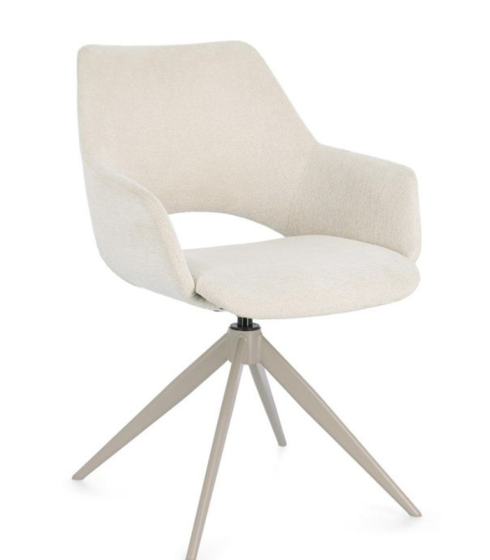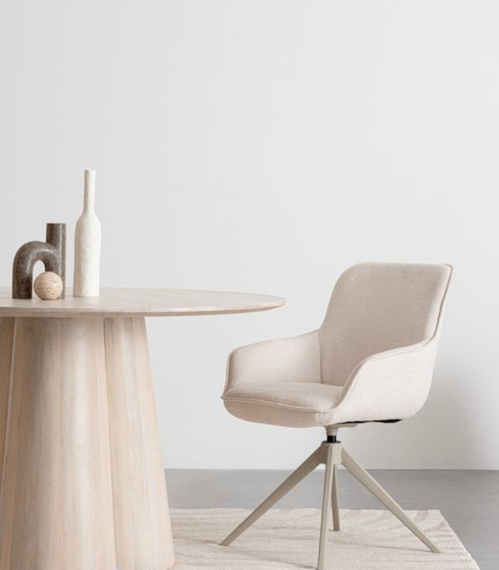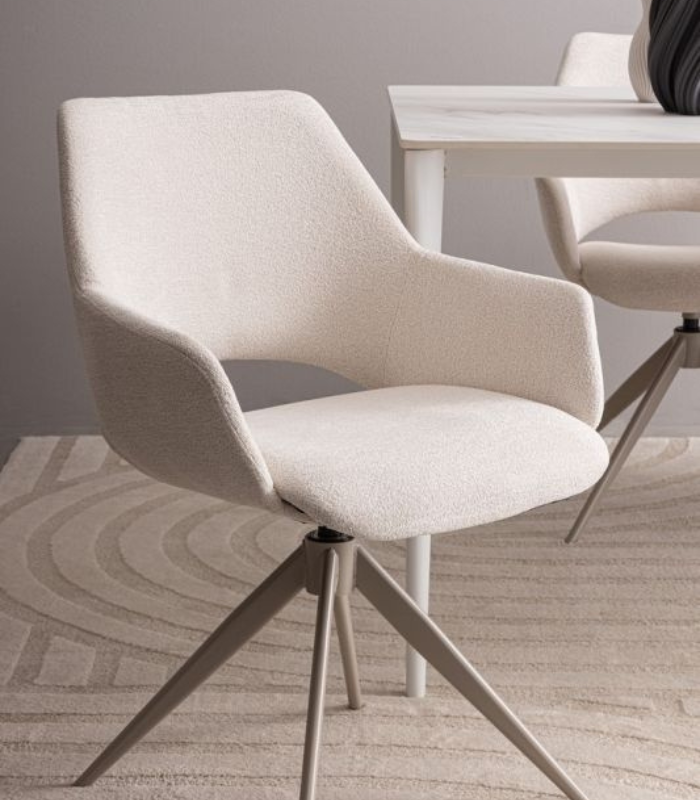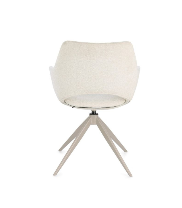 The Vivian Moon chair redefines functional elegance for the most demanding interiors. Its sophisticated design features a plywood seat, meticulously padded with polyurethane foam to ensure superior comfort. The high-quality polyester upholstery wraps an enveloping structure that rests on a 360° swivel base with an advanced automatic return mechanism. Its steel legs, finished with epoxy powder coating, provide exceptional durability and a minimalist touch, ideal for luxury dining rooms or designer offices.
